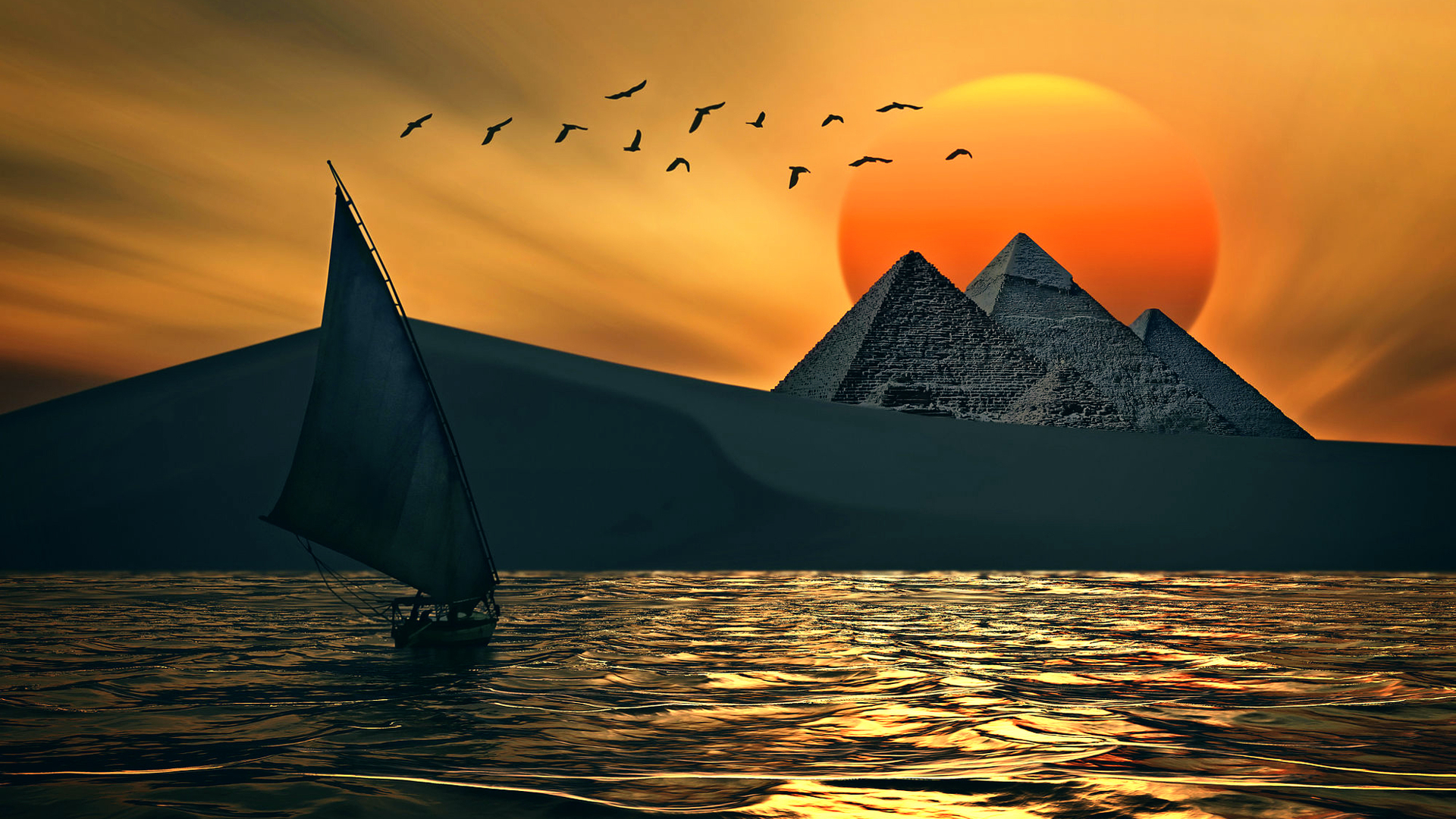 手绘 夕阳 大海 帆船