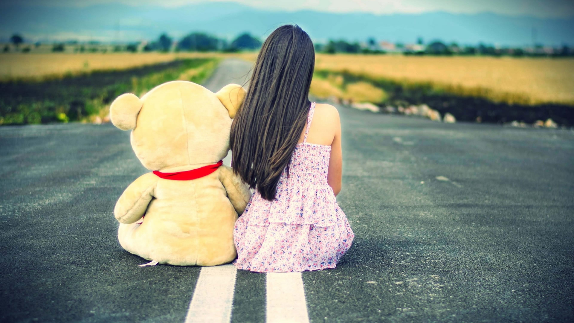 小清新 唯美 温馨 安静 美女 背影 熊 长发