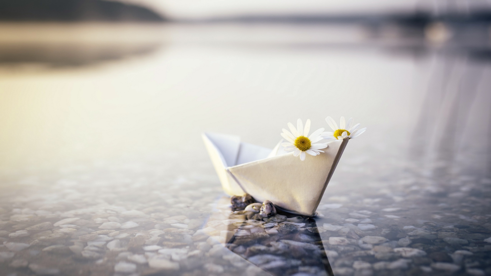 静物写真 纸船 菊花 雏菊 石头