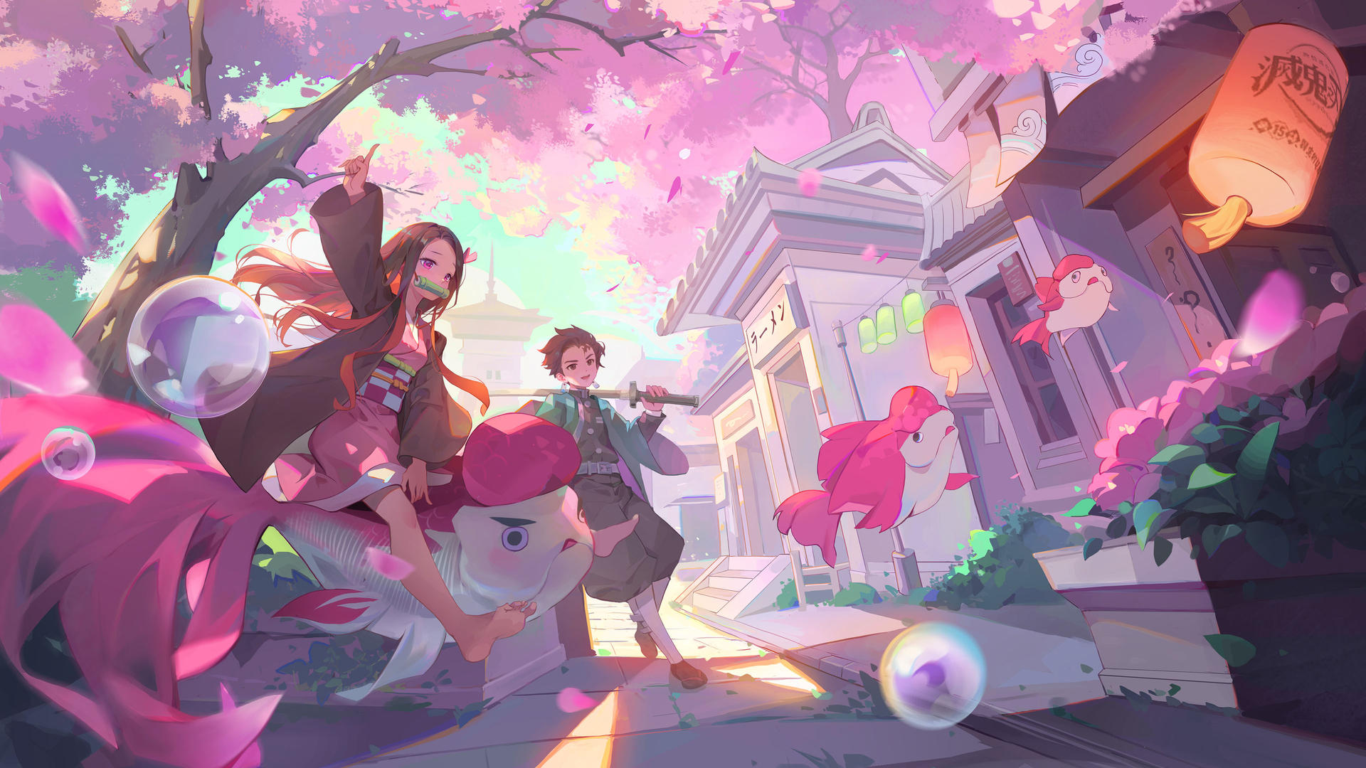鬼灭之刃 炭治郎 祢豆子 樱花 鲤鱼