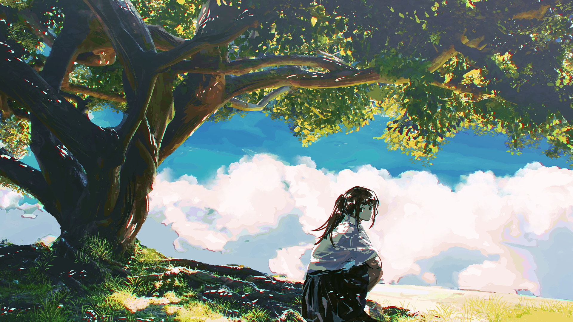 树荫下 白云 长发女孩