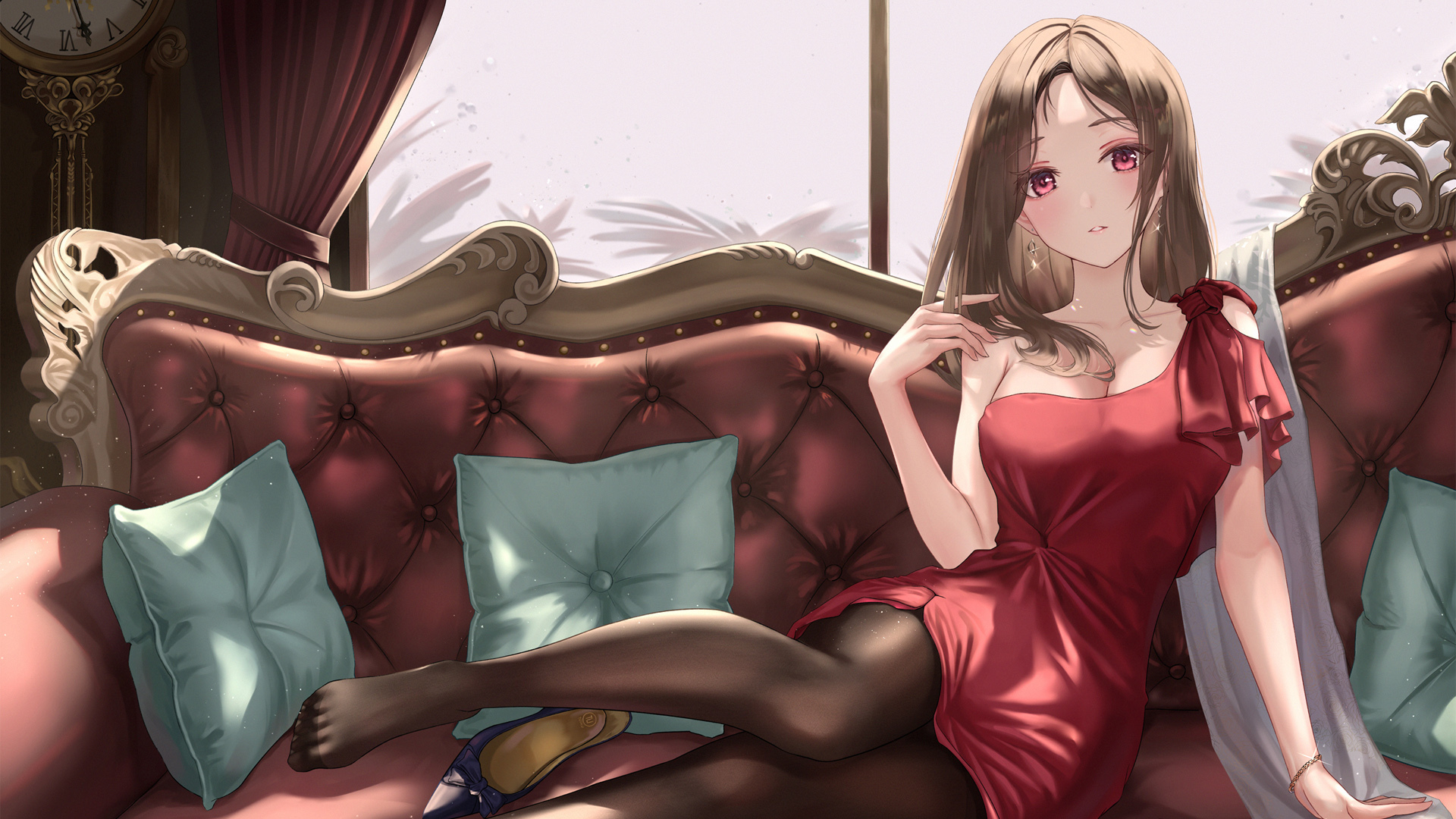动漫 沙发 可爱女子 红色裙子 美腿 丝袜