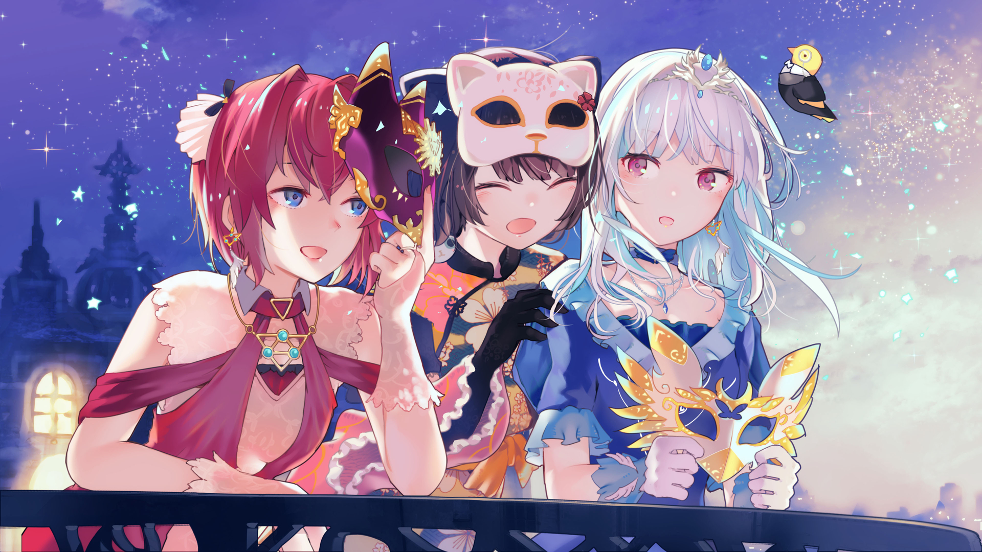 卡通人物 面具 精灵鸟 城堡 星空