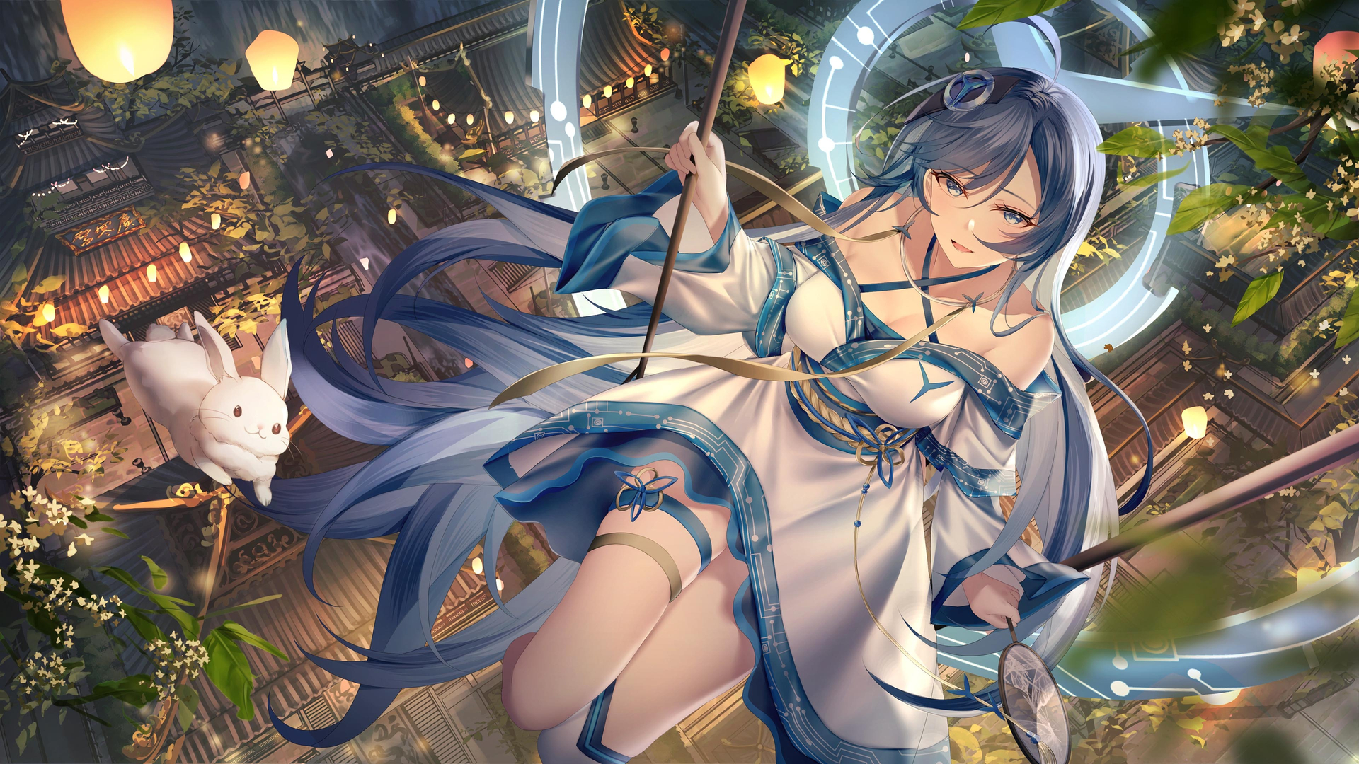 荡秋千 古风美女 夜晚 孔明灯