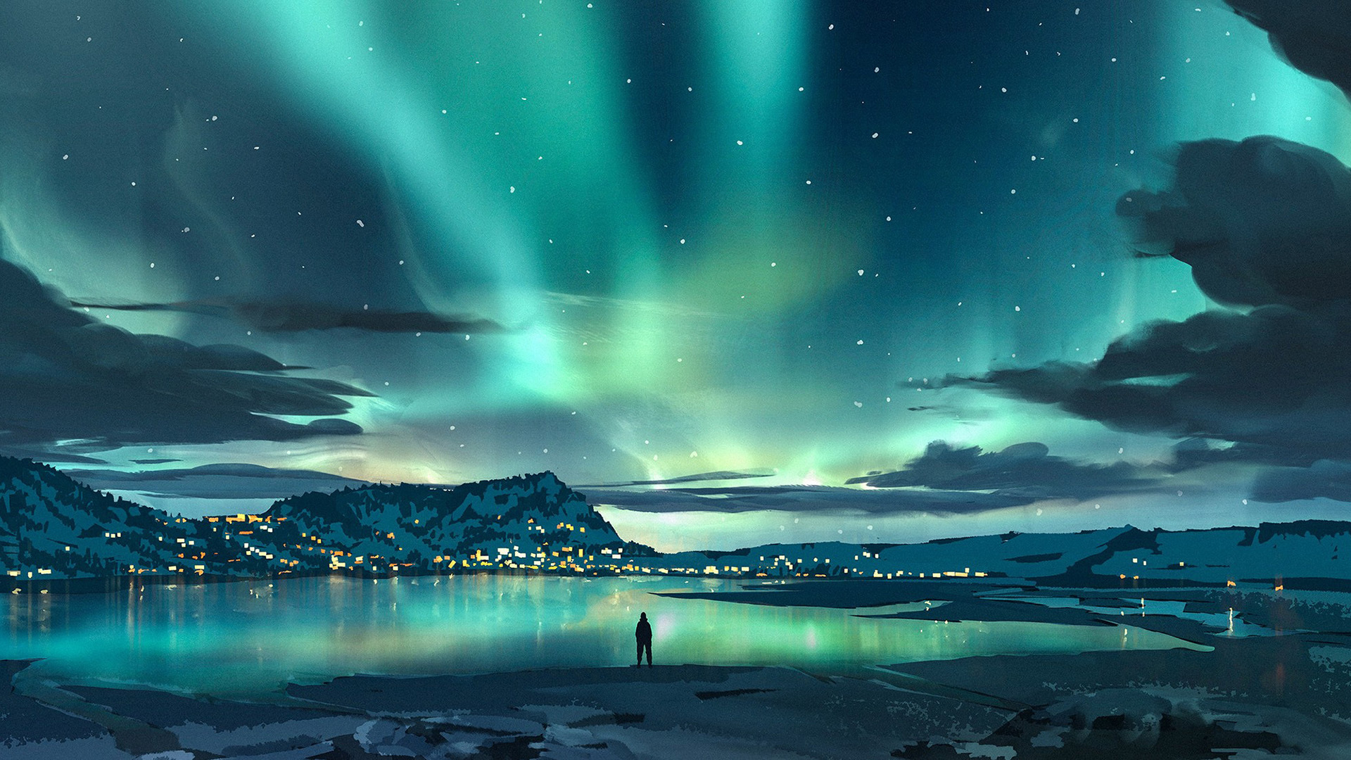 极光 奇幻 湖水 灯光 夜景