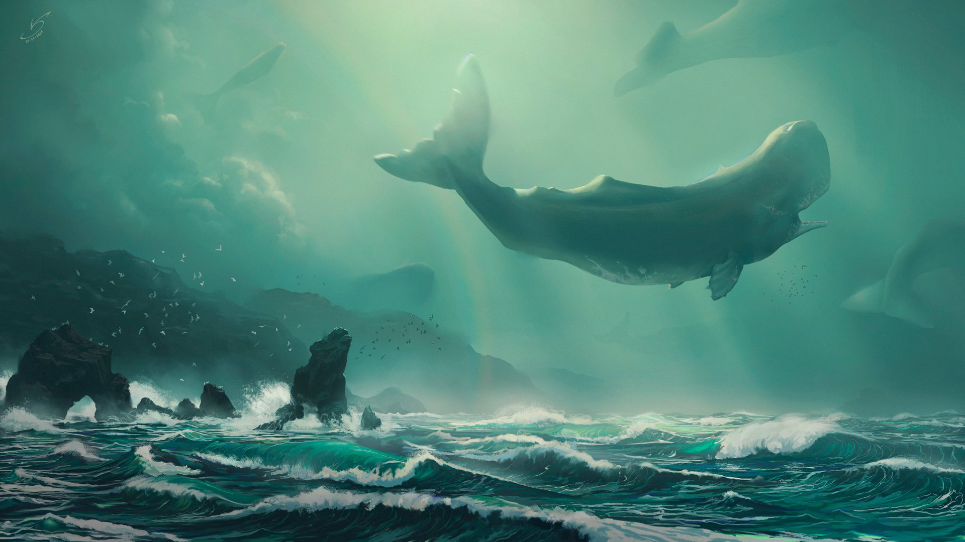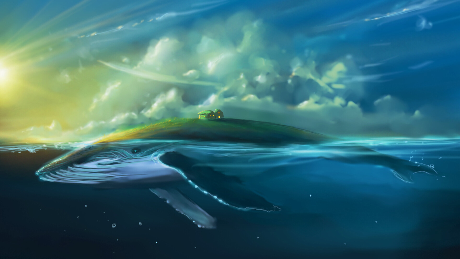 鲸鱼 阳光 漂浮岛屿 小屋