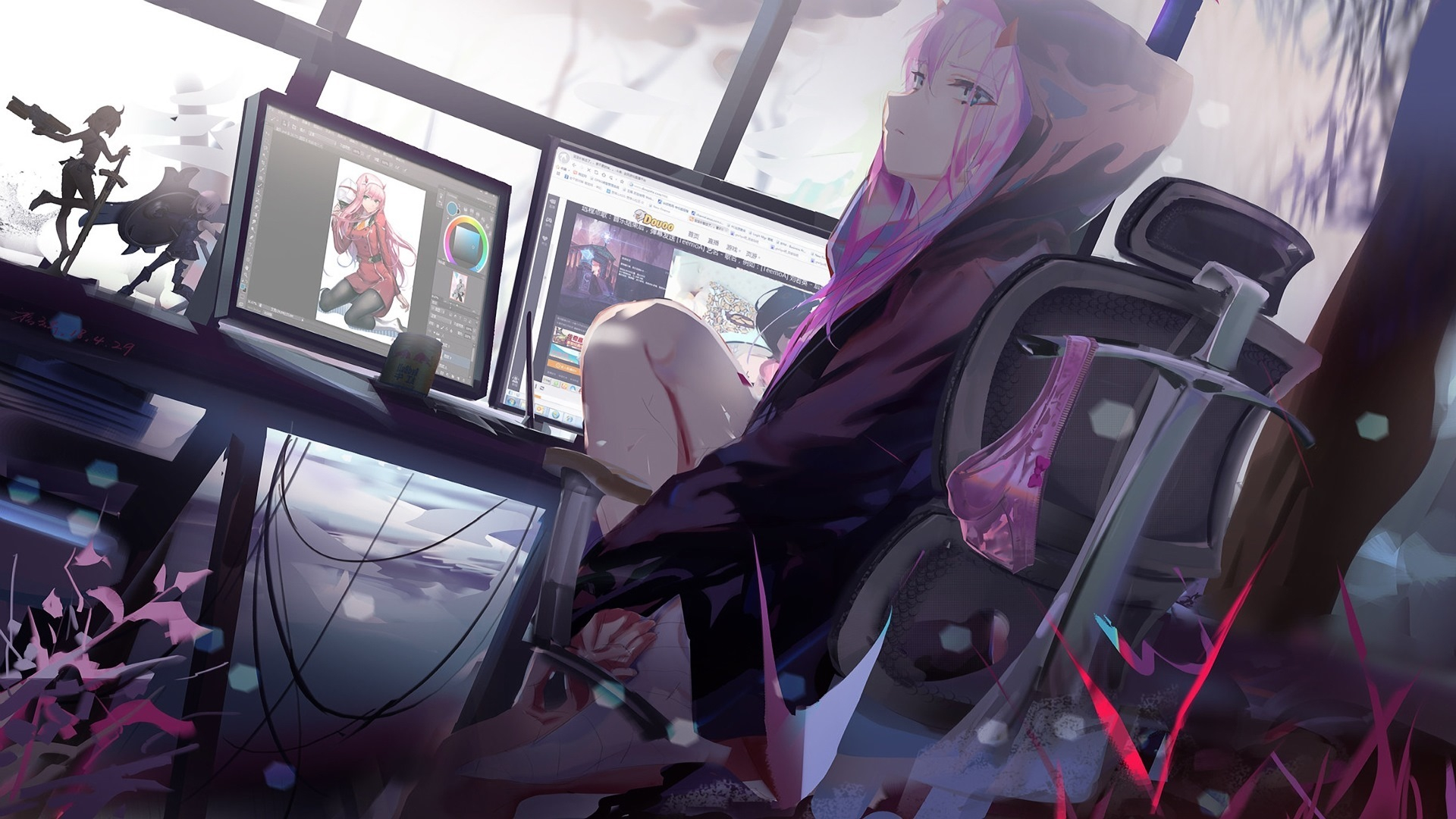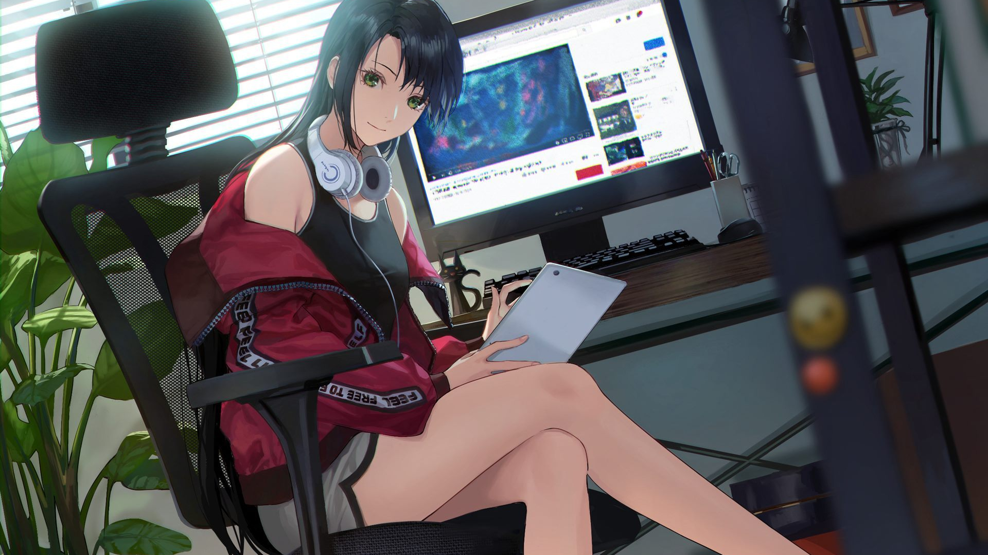 卡通人物 耳机 电脑 长腿 办公室