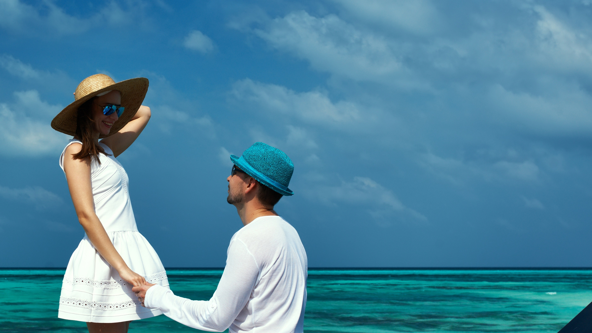 情侣 大海 草帽 亲密