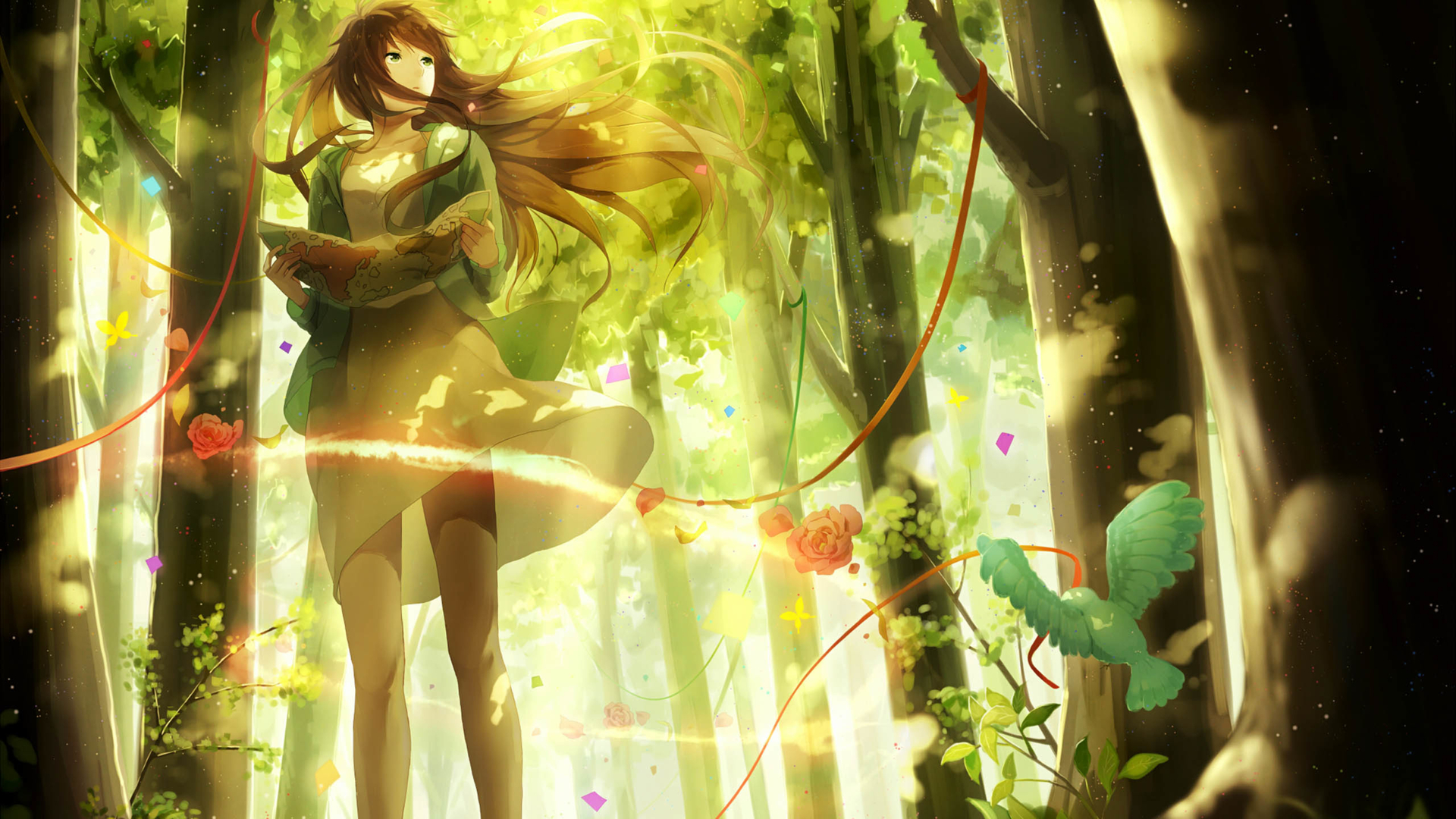 插画 森林 鲜花 小鸟 绿色
