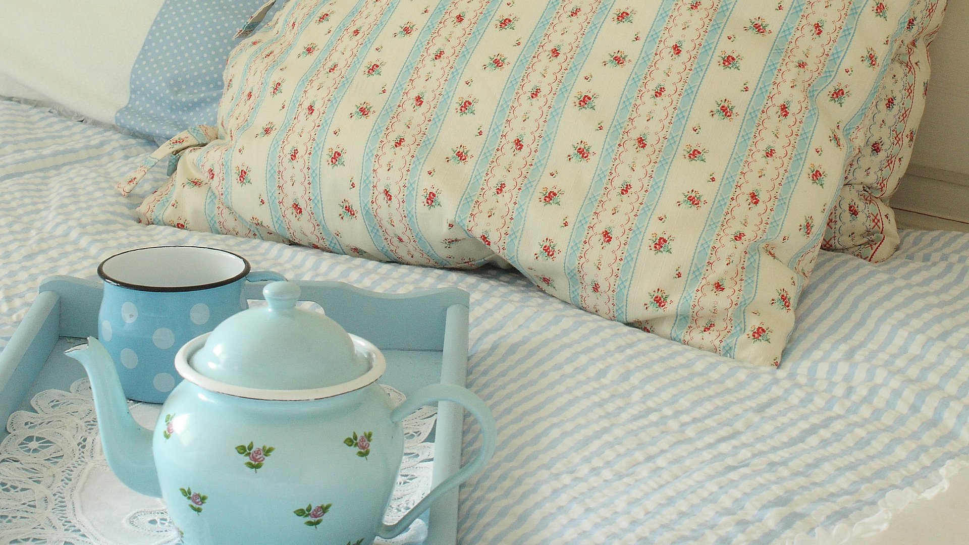 蓝色家居 床单 枕头 水壶