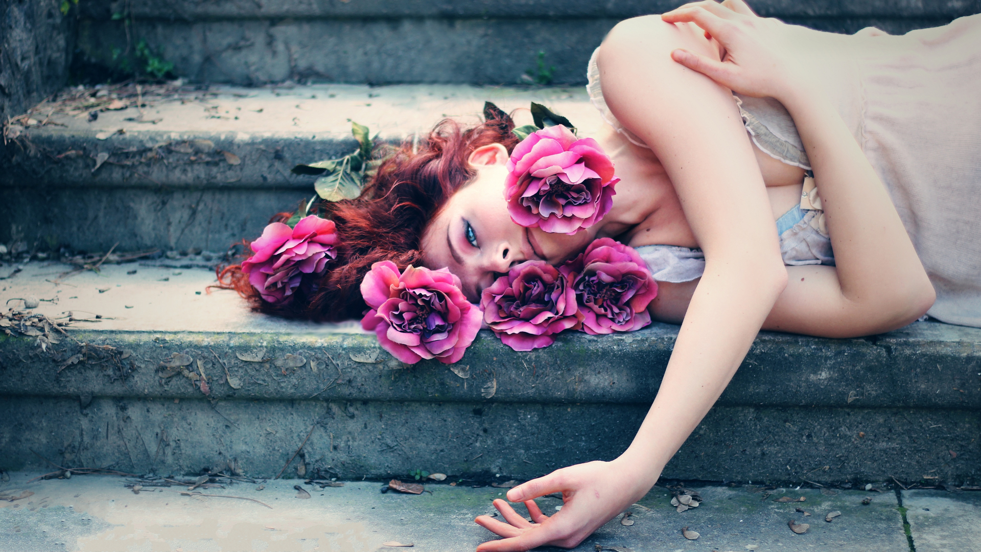美女 鲜花 台阶