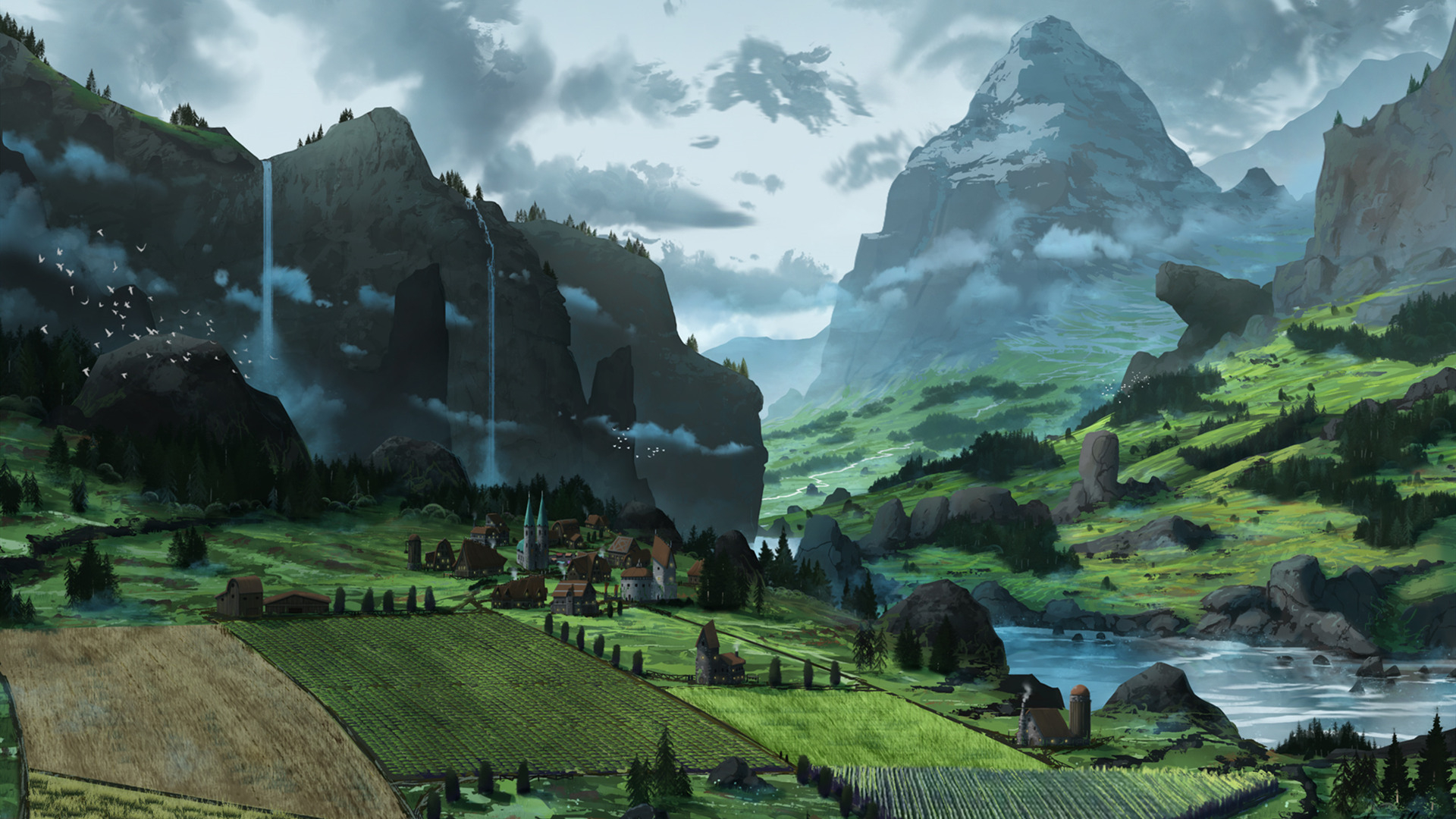 农田 乡村 瀑布 河流 高山