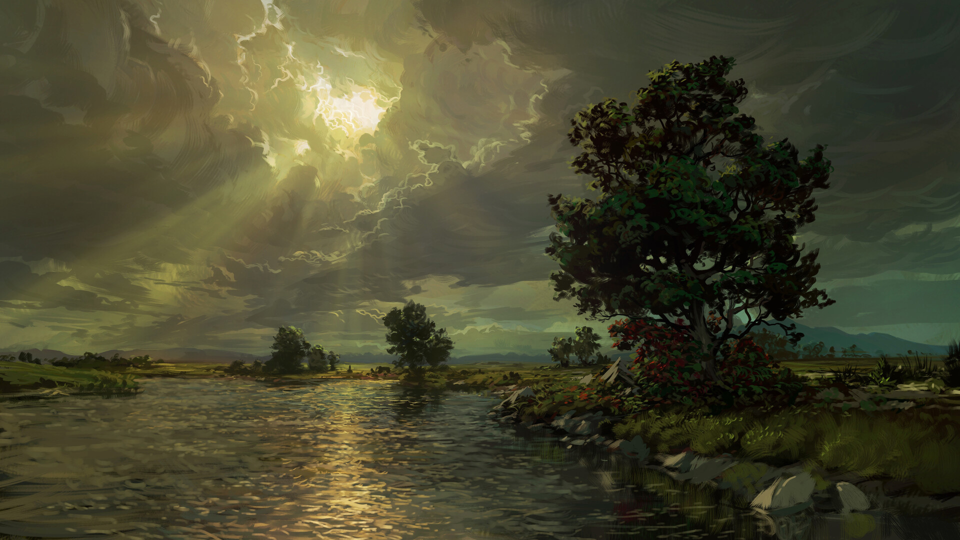 阴天 河畔 波光凌凌 阳光