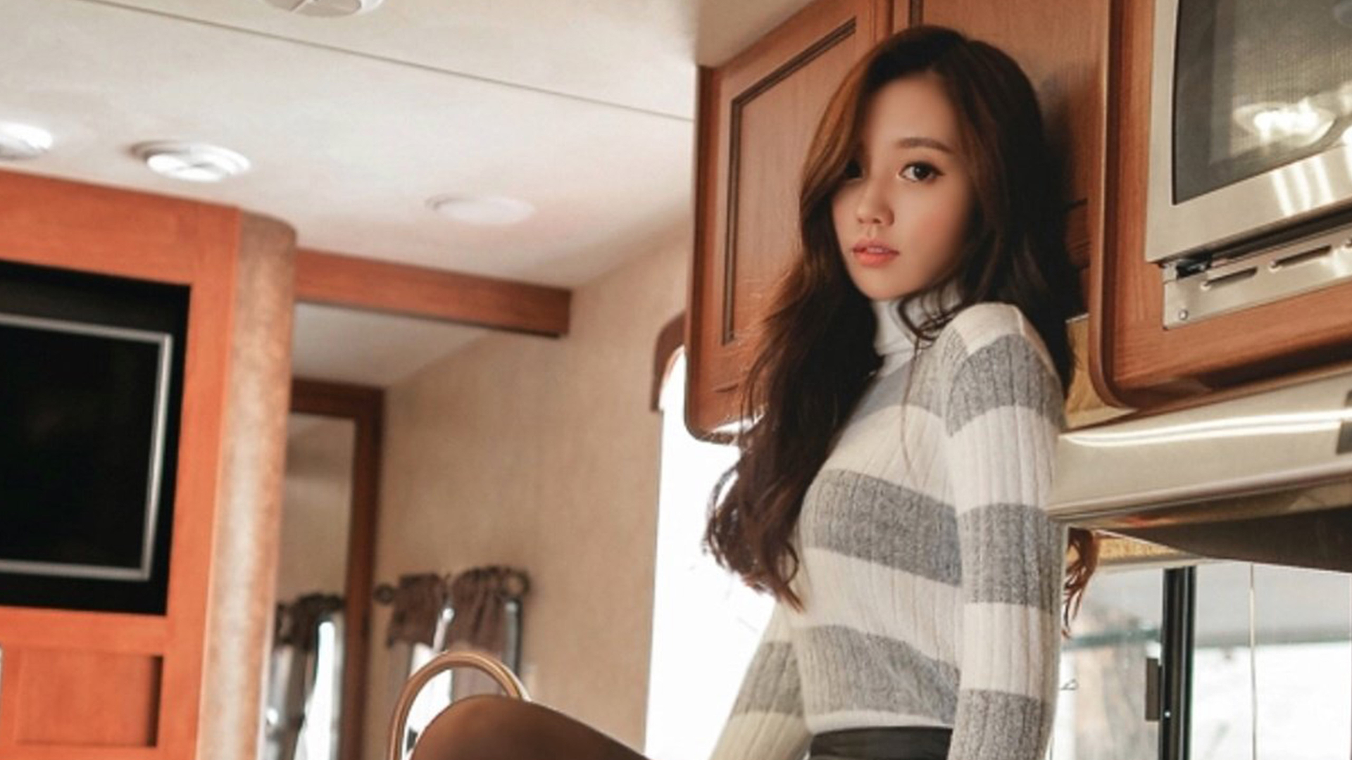 清纯 毛衣 长发 卷发 厨房