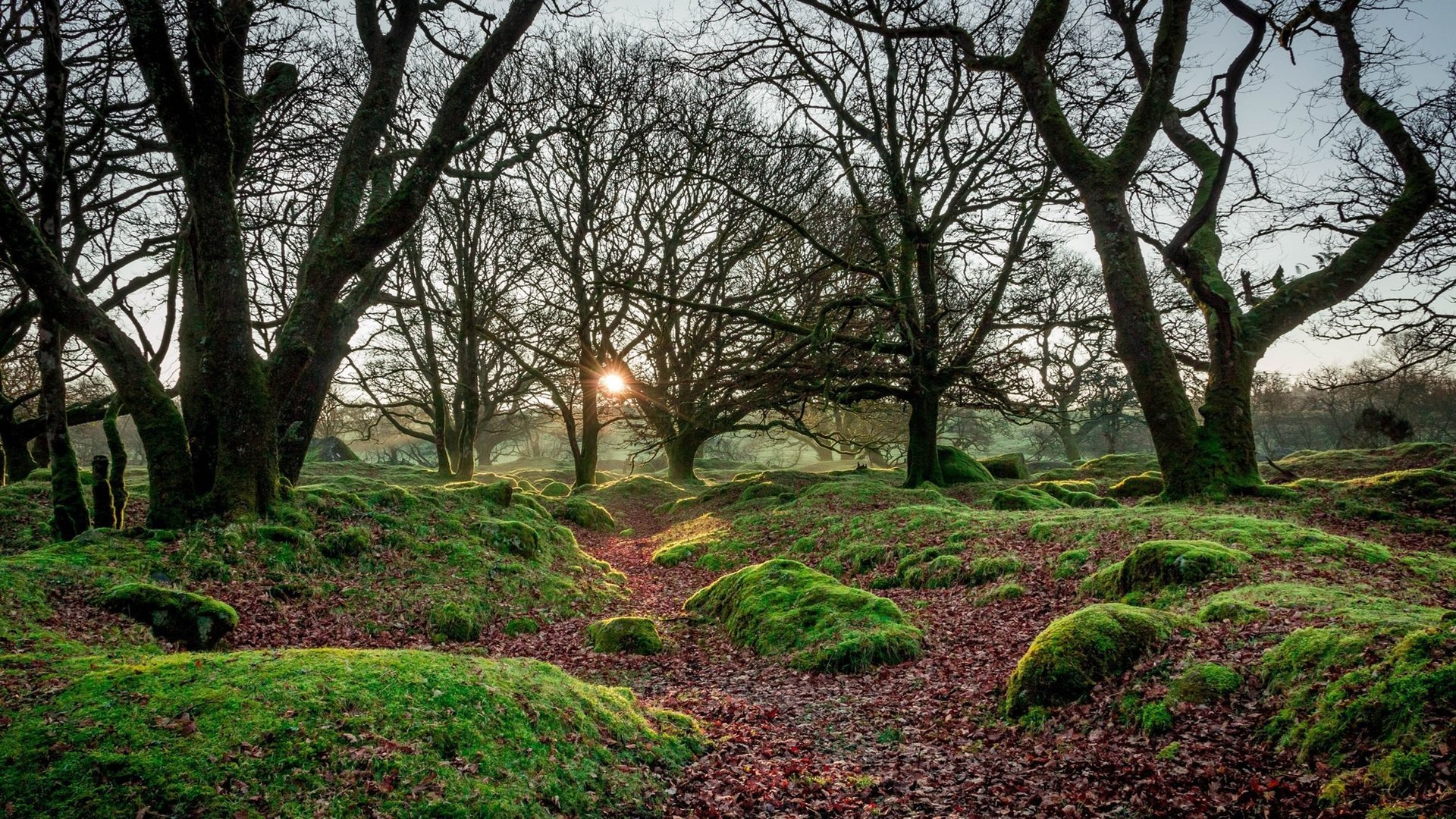 自然风光 日出 树林 青苔 苔藓