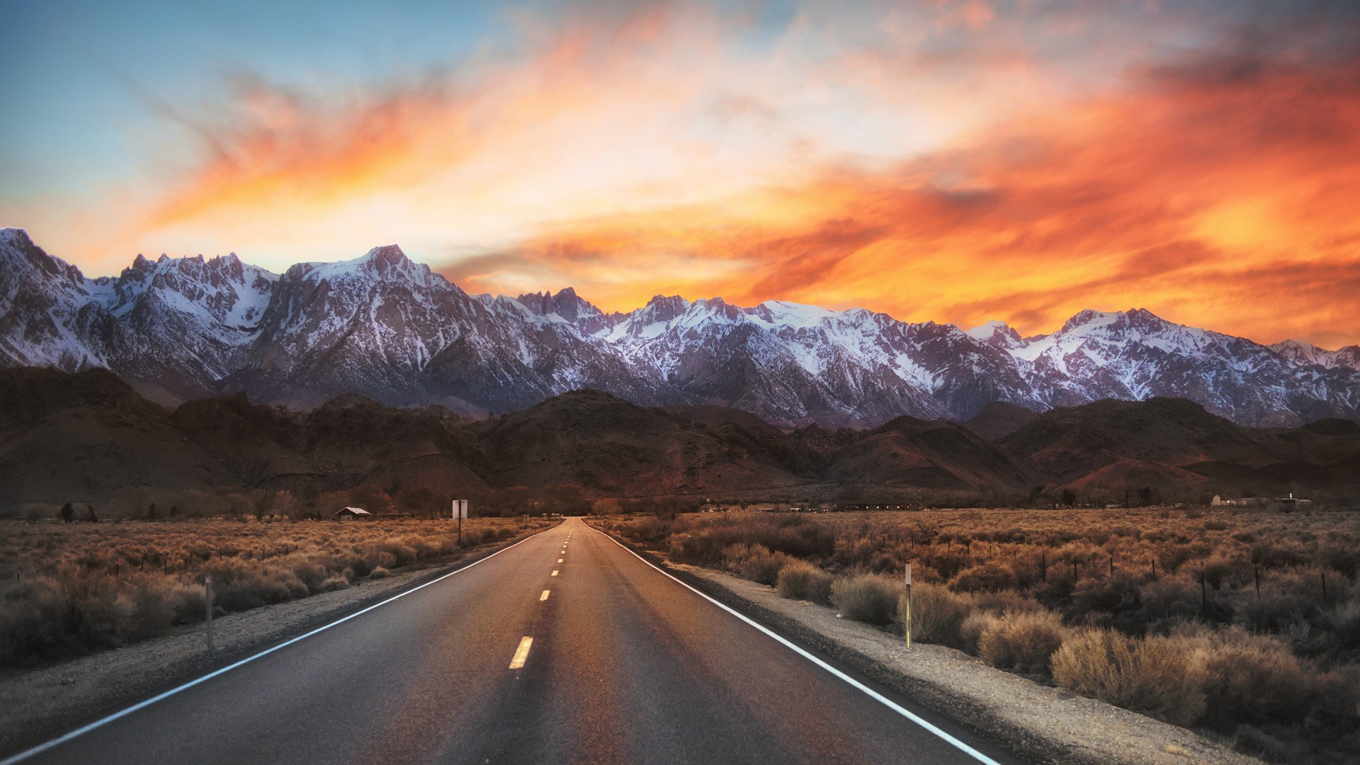 自然风光 雪山 公路 笔直 晚霞