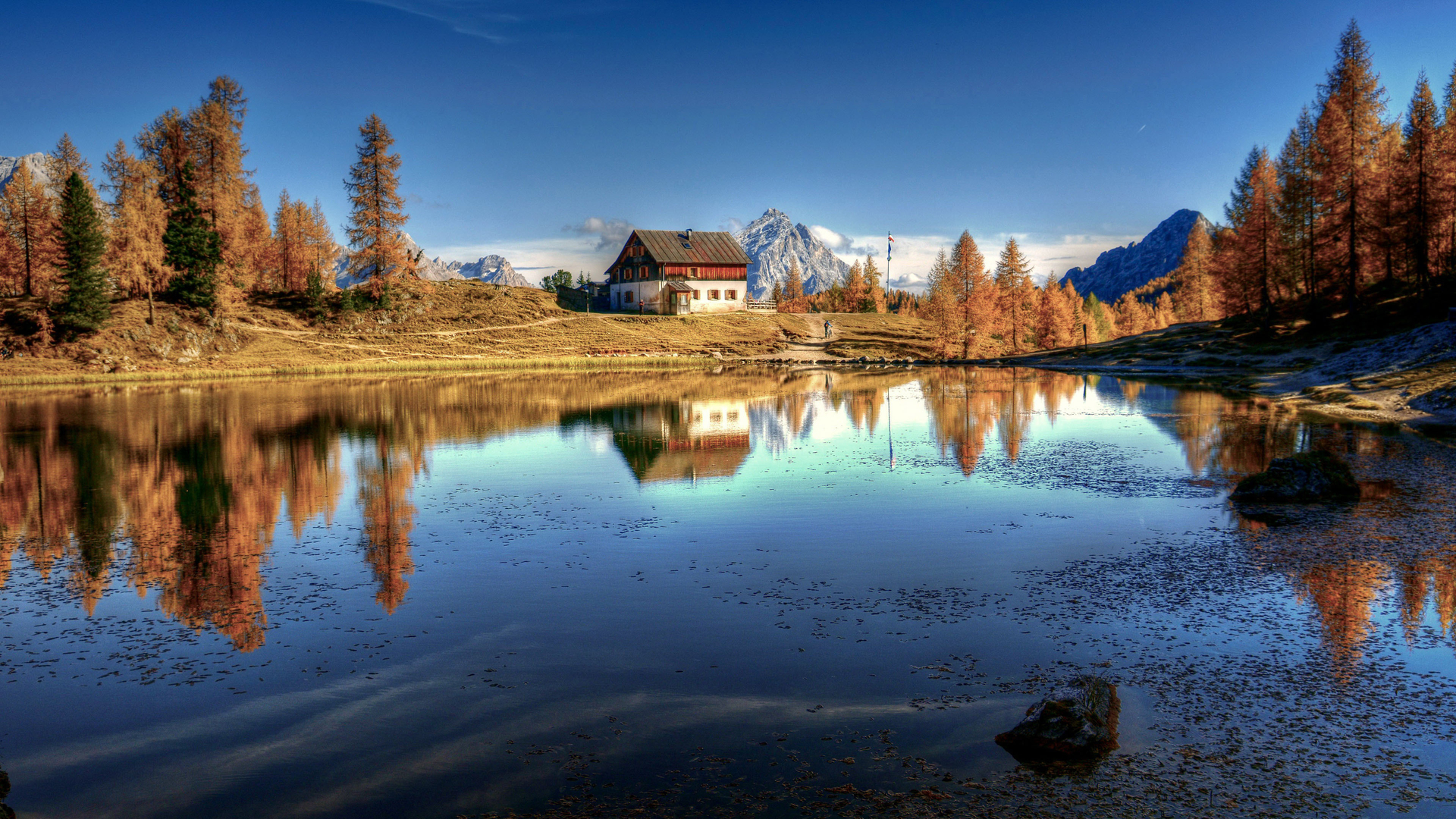 秋意正浓 倒影 小屋 枯黄