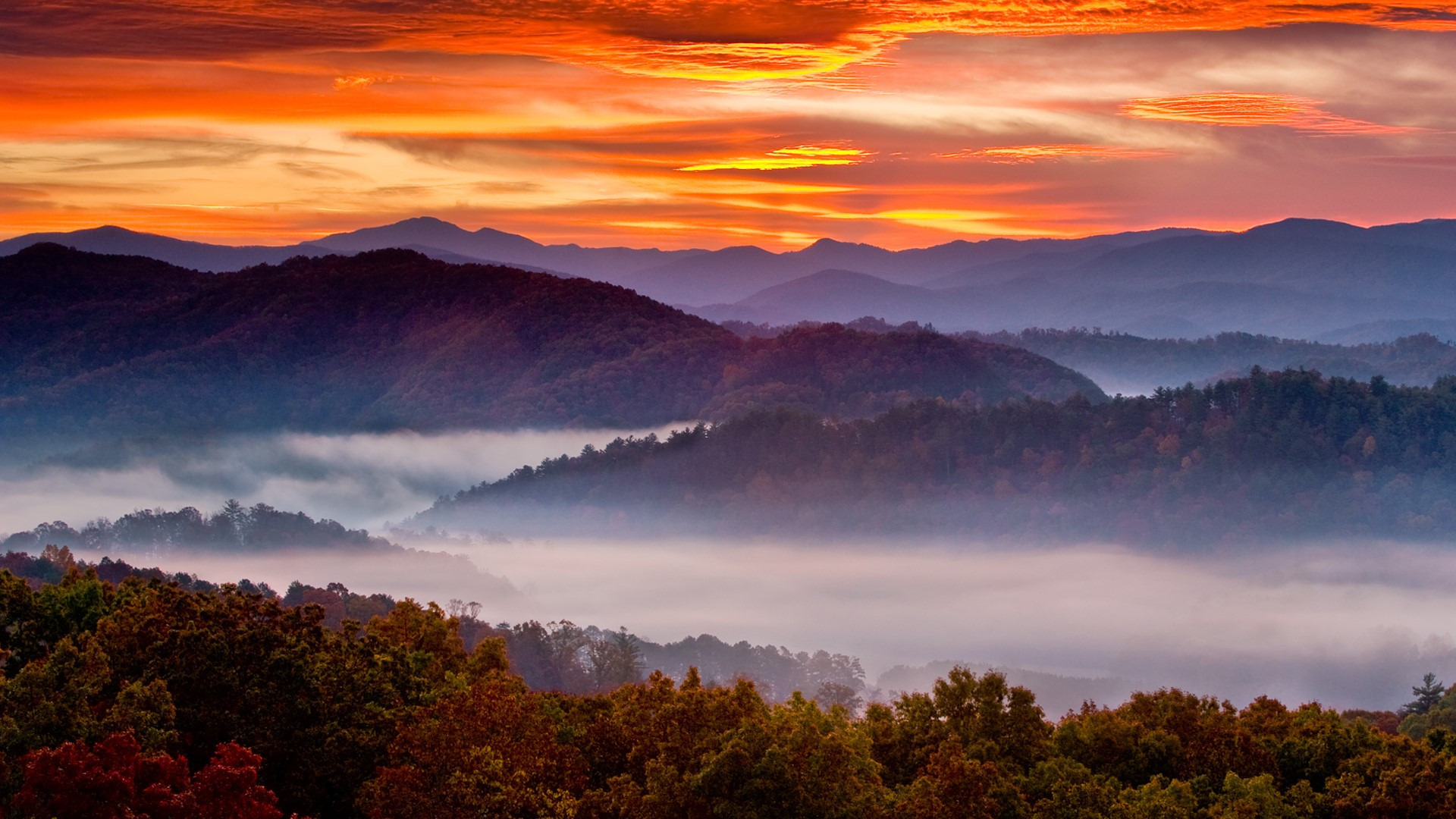 秋意正浓 晚霞 雾 群山