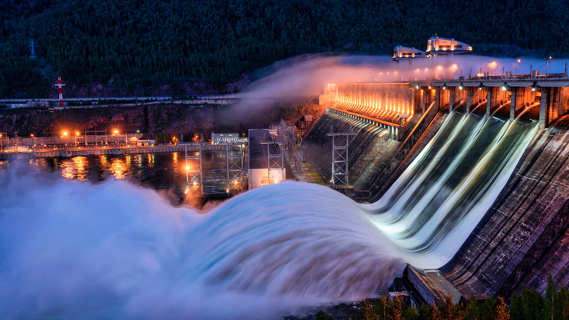 城市夜景 水库 水坝 汹涌 壮观