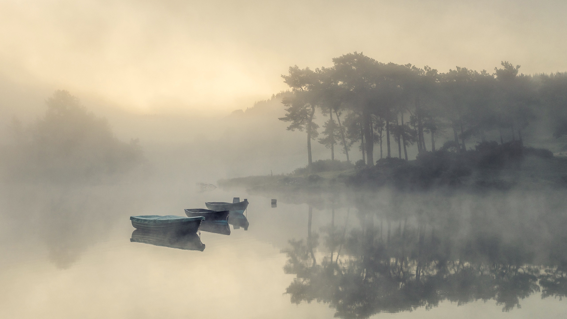 自然风光 迷雾 小船 倒影